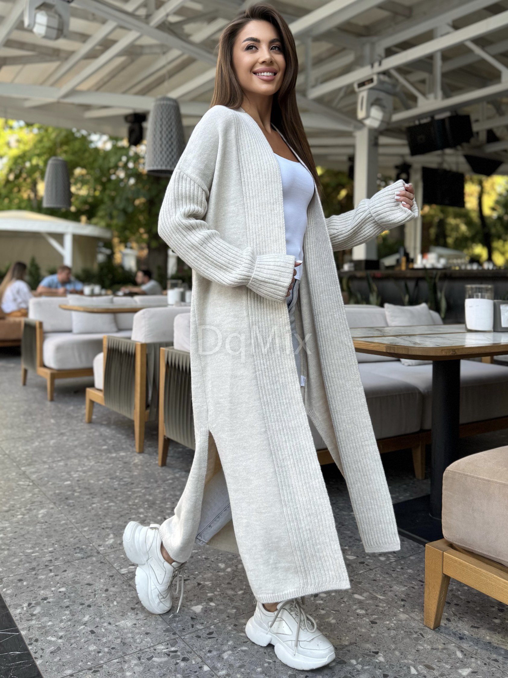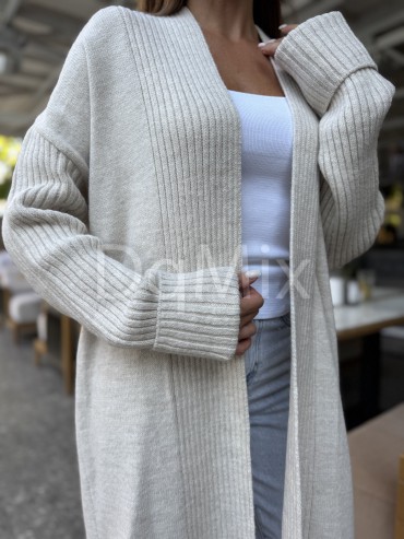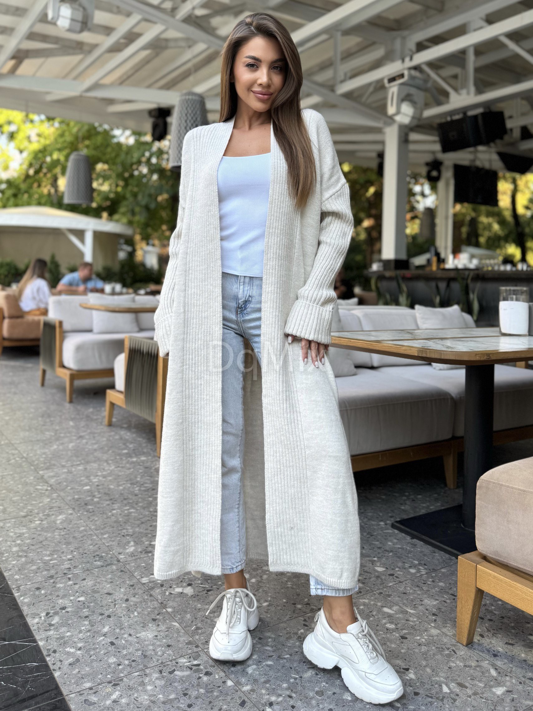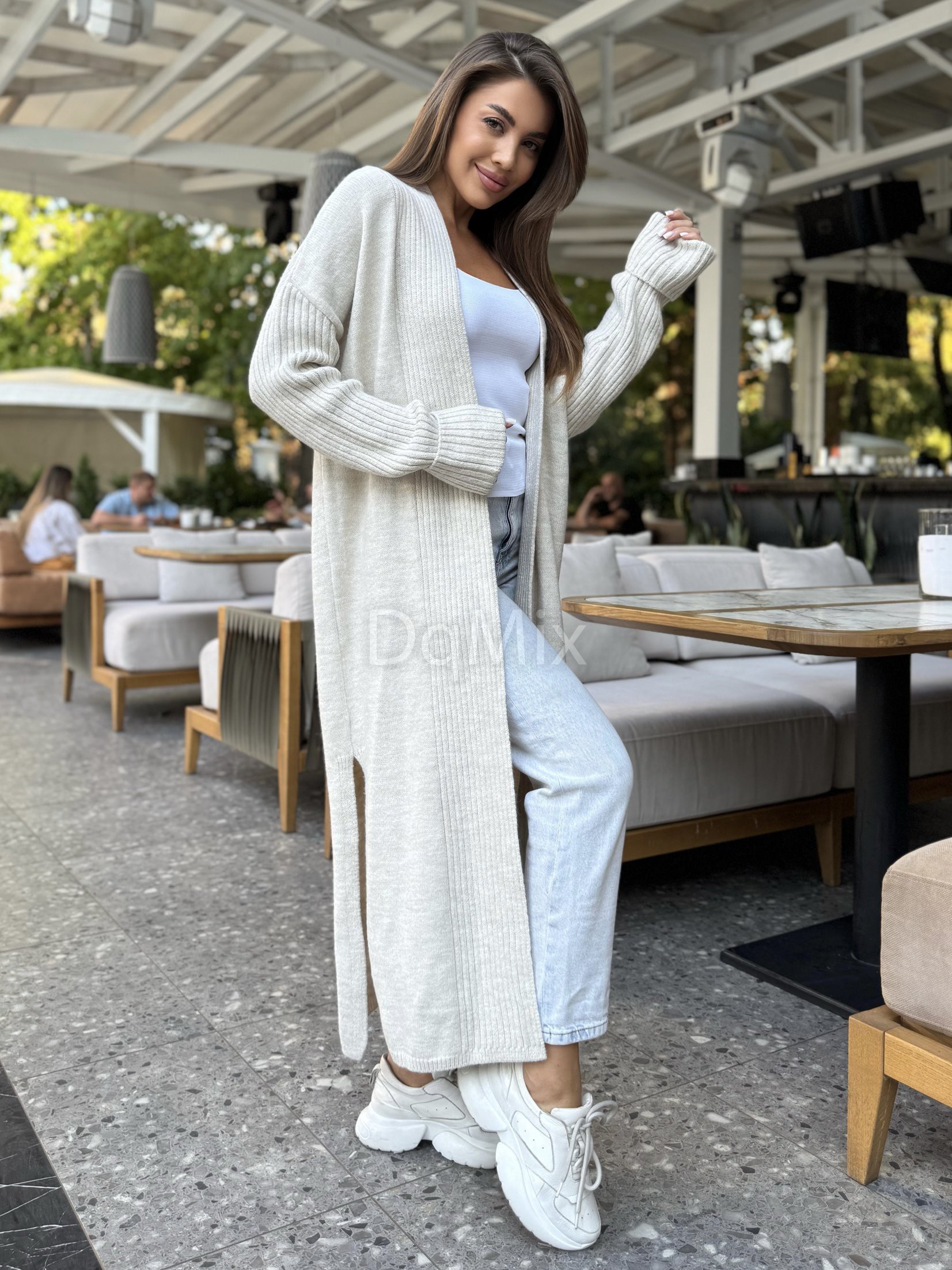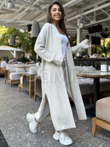 Бежевий подовжений кардиган із манжетом та розрізами прямого вільного крою #92573