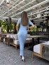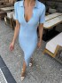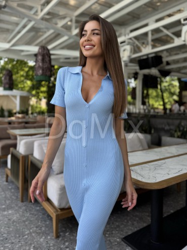 Блакитна елегантна сукня міді із комірцем на ґудзиках з розрізом короткий рукав #97000