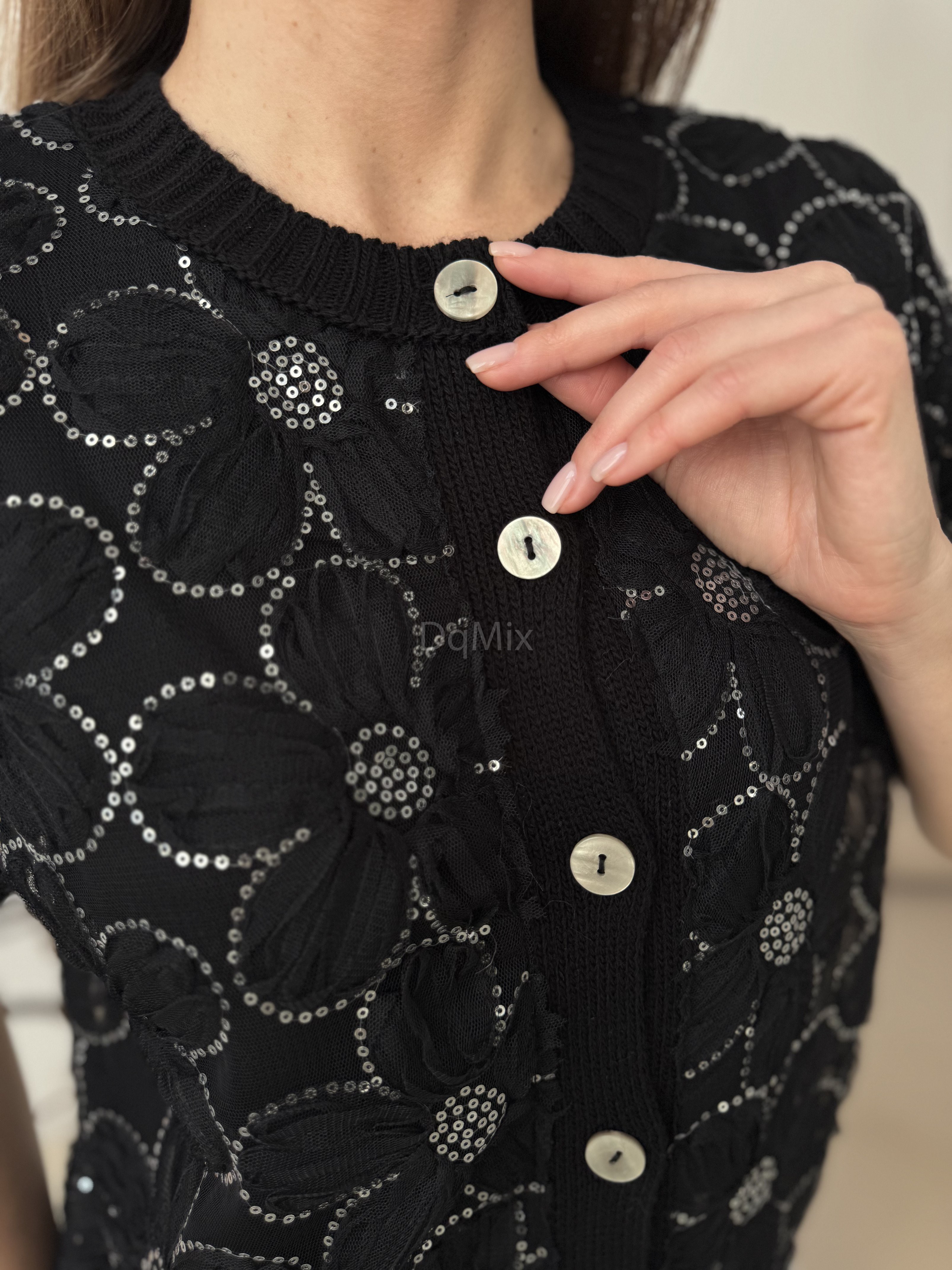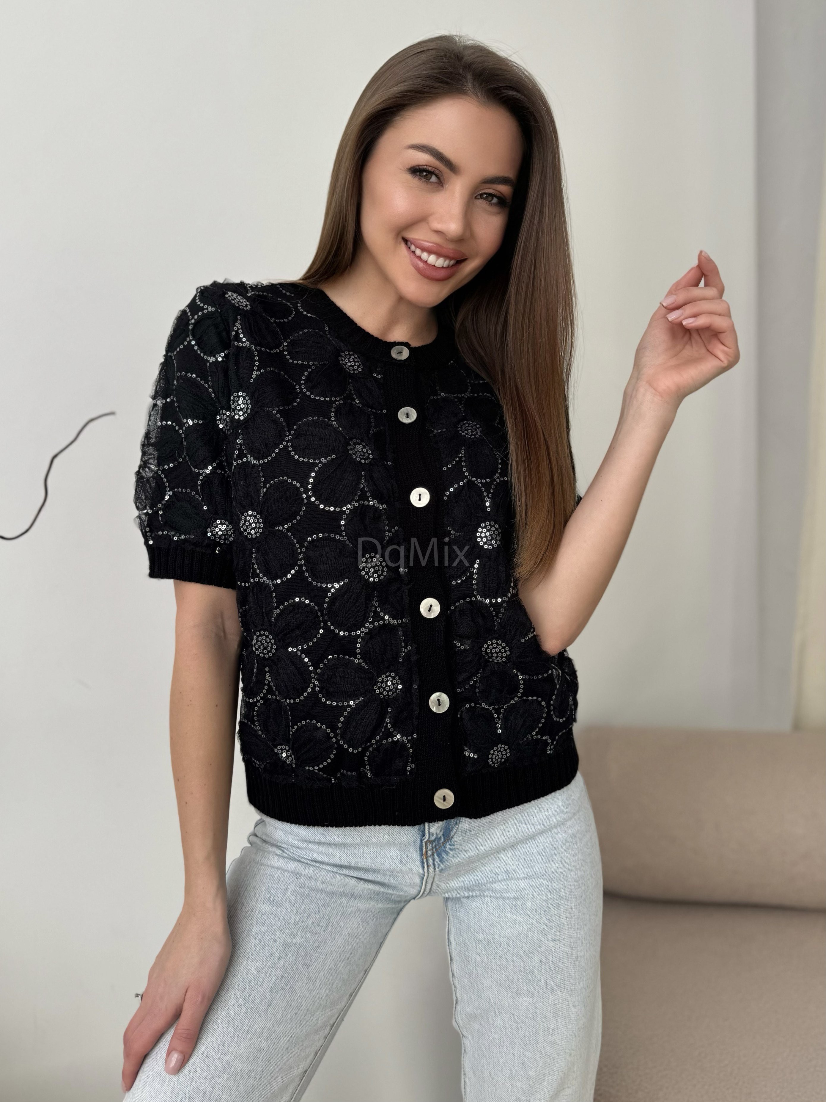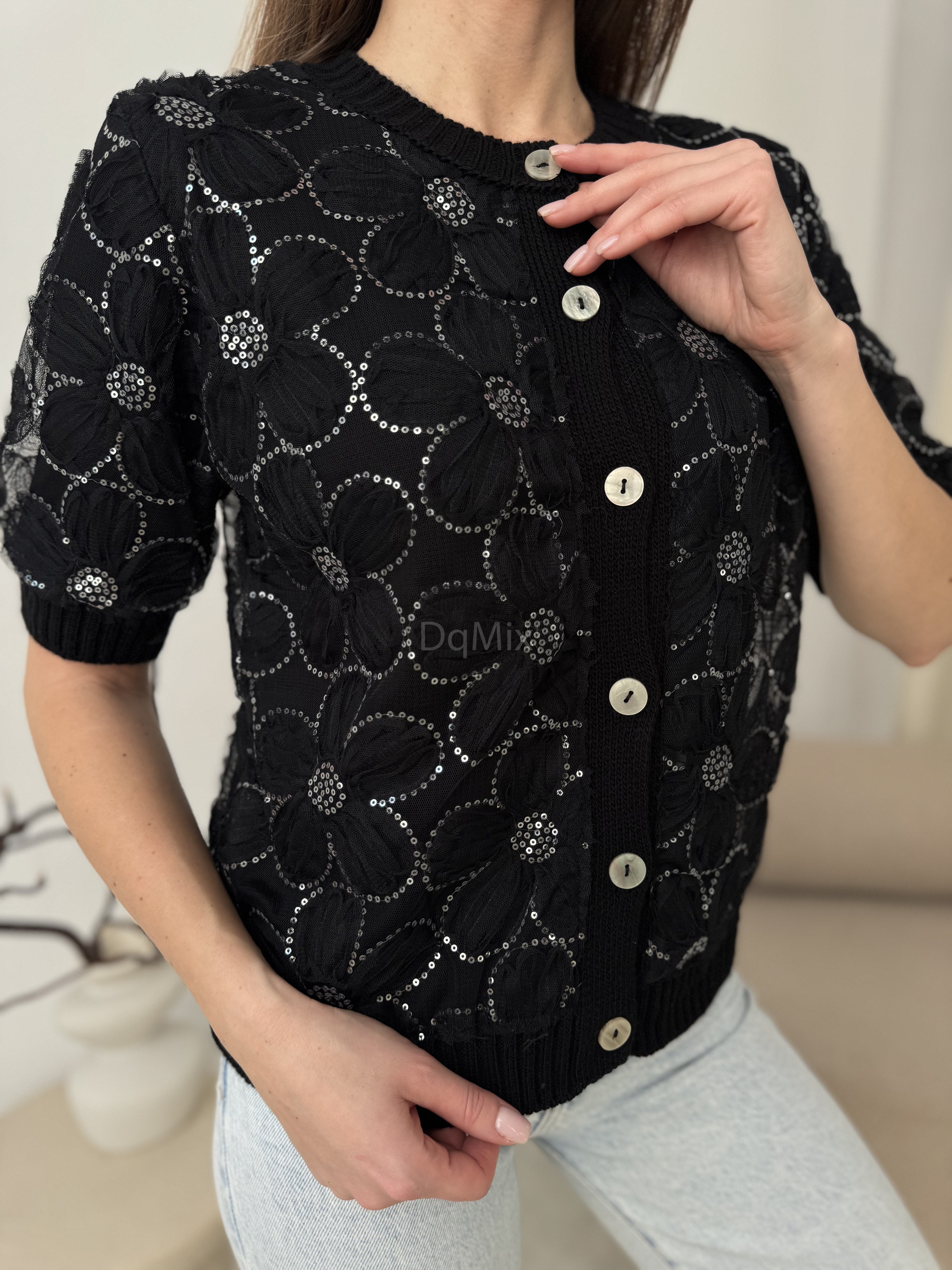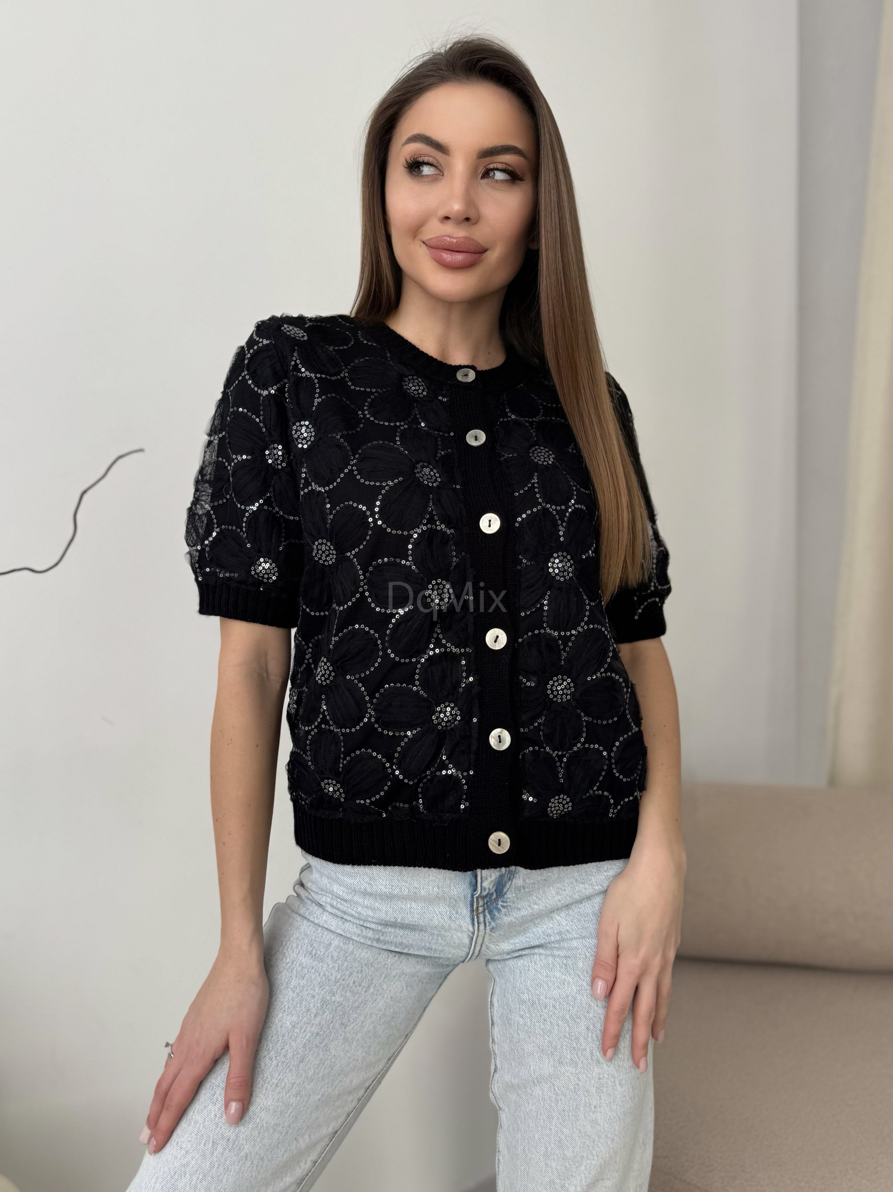 Чорна кофтинка на ґудзиках із «декоративними квіточками» #8501