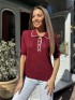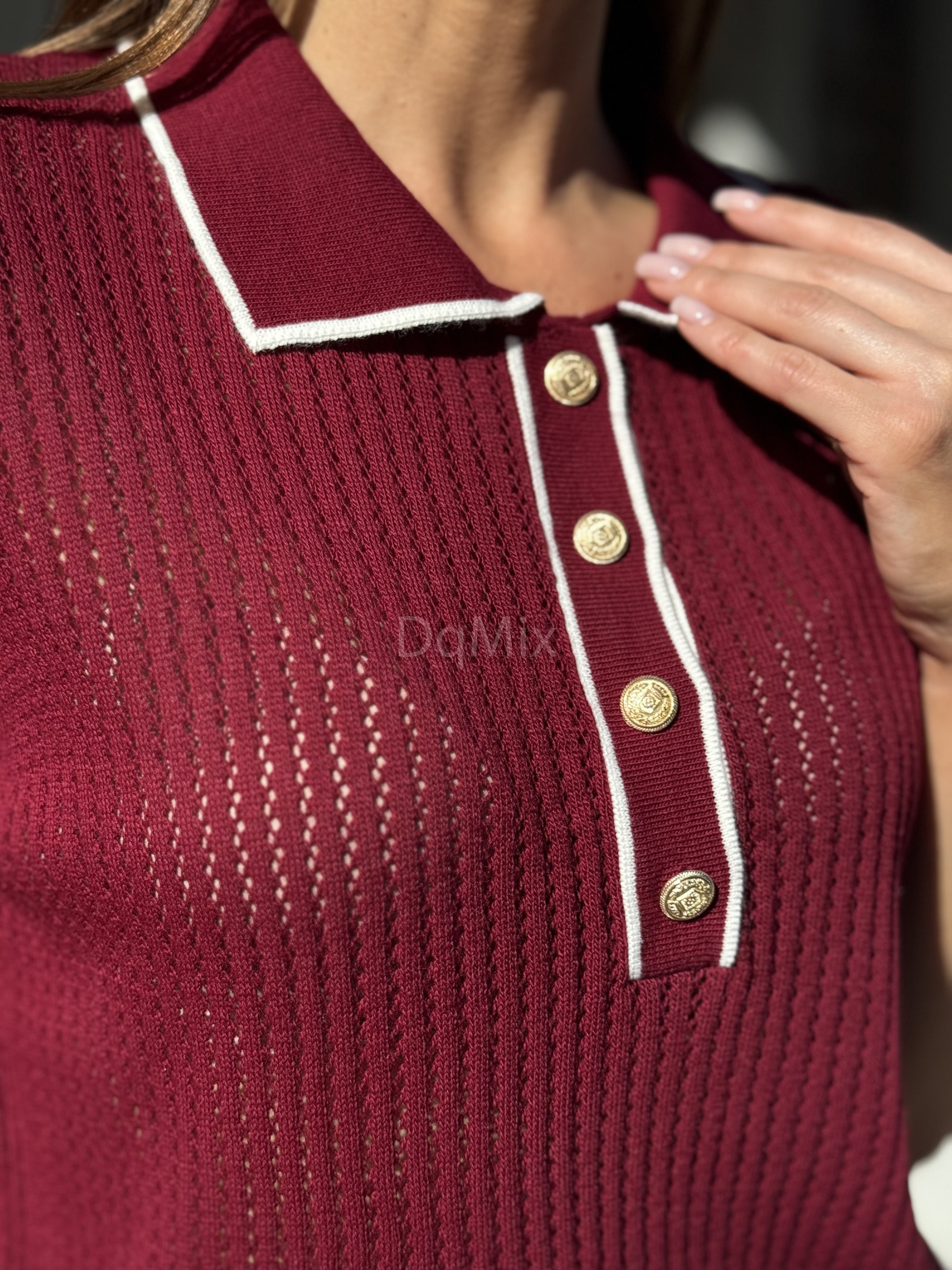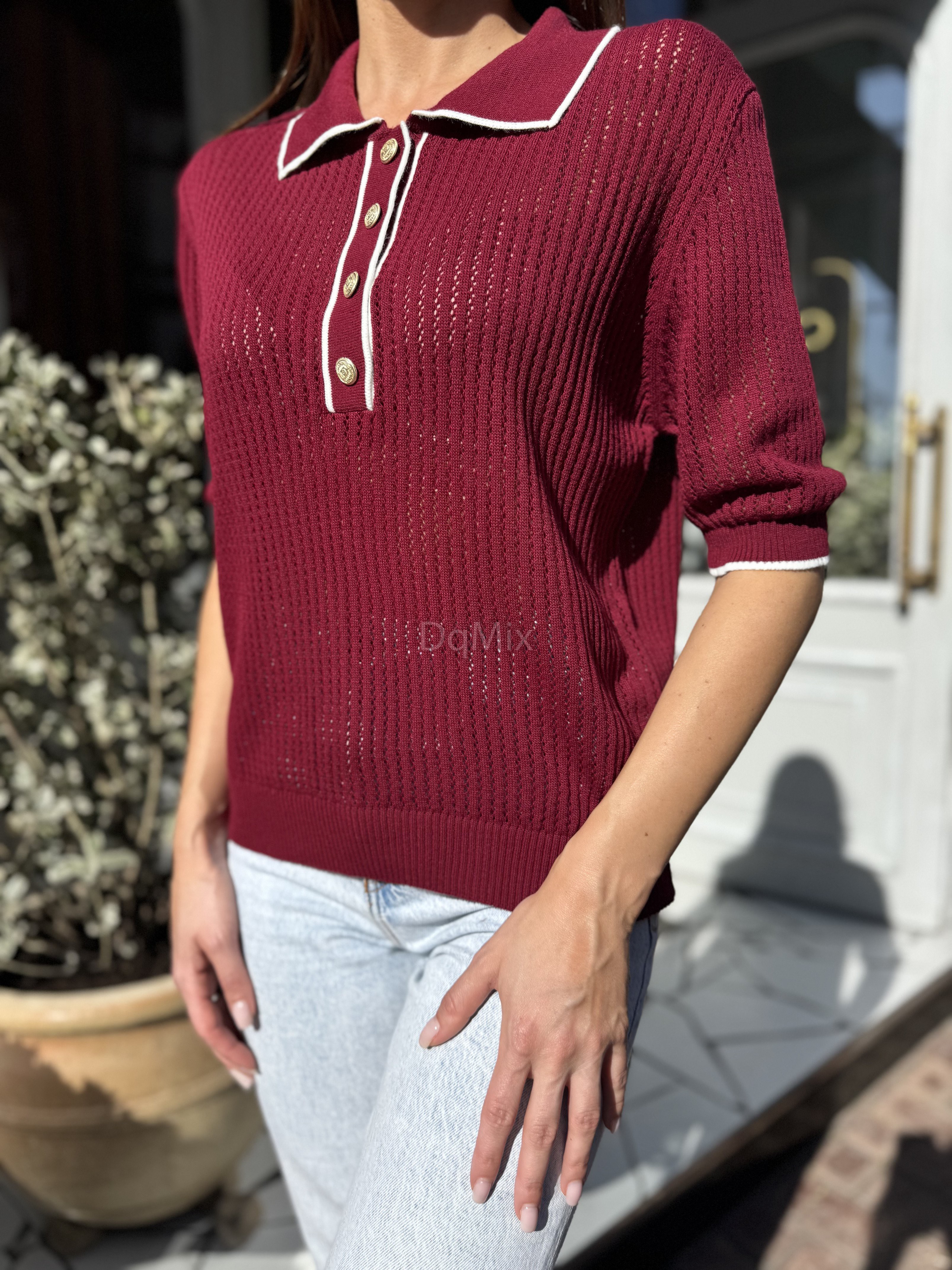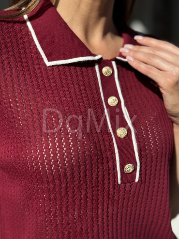 Кофтинка ажурна вʼязка із комірцем на ґудзиках у кольорі бордо #14037