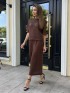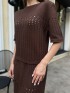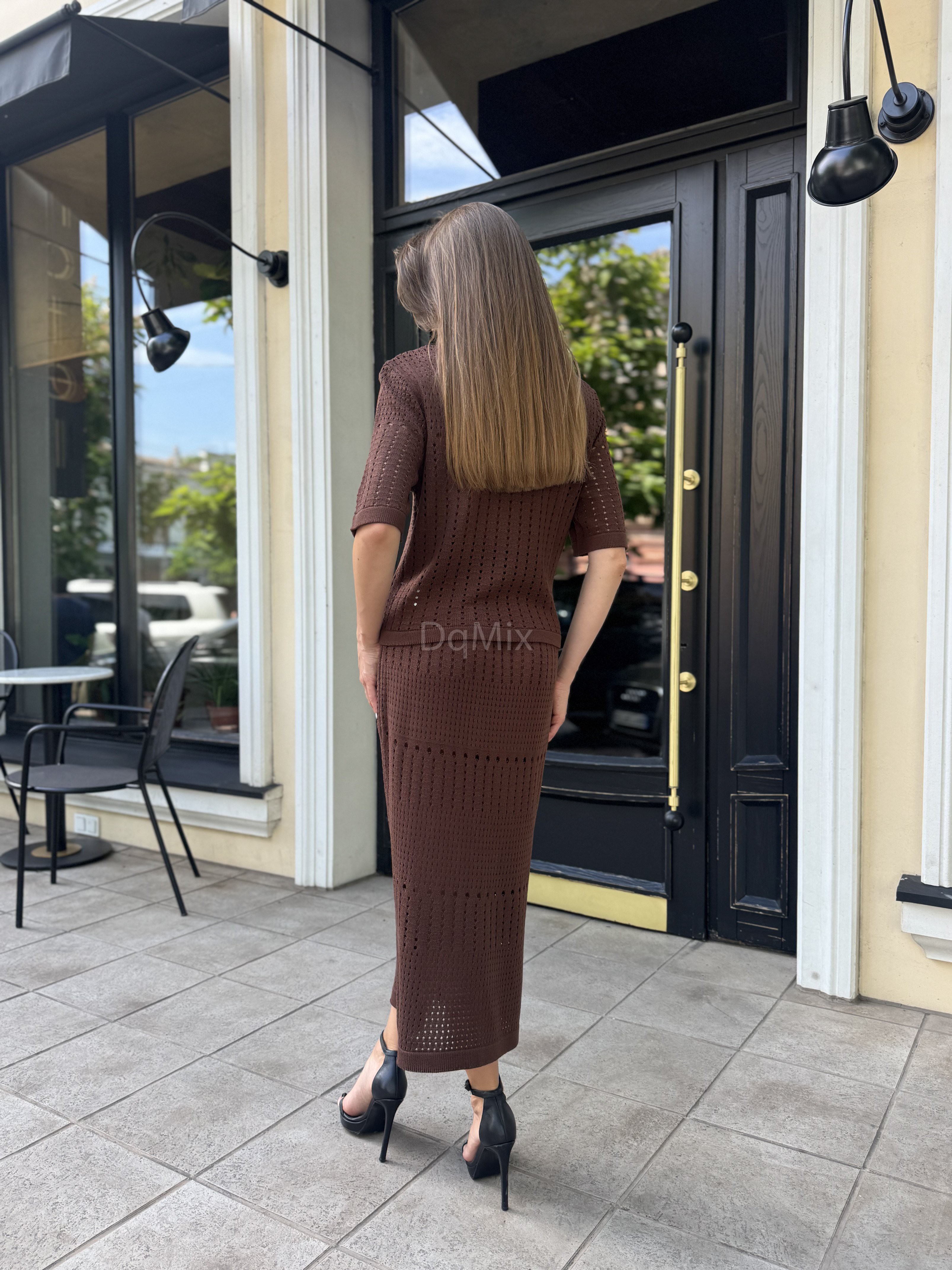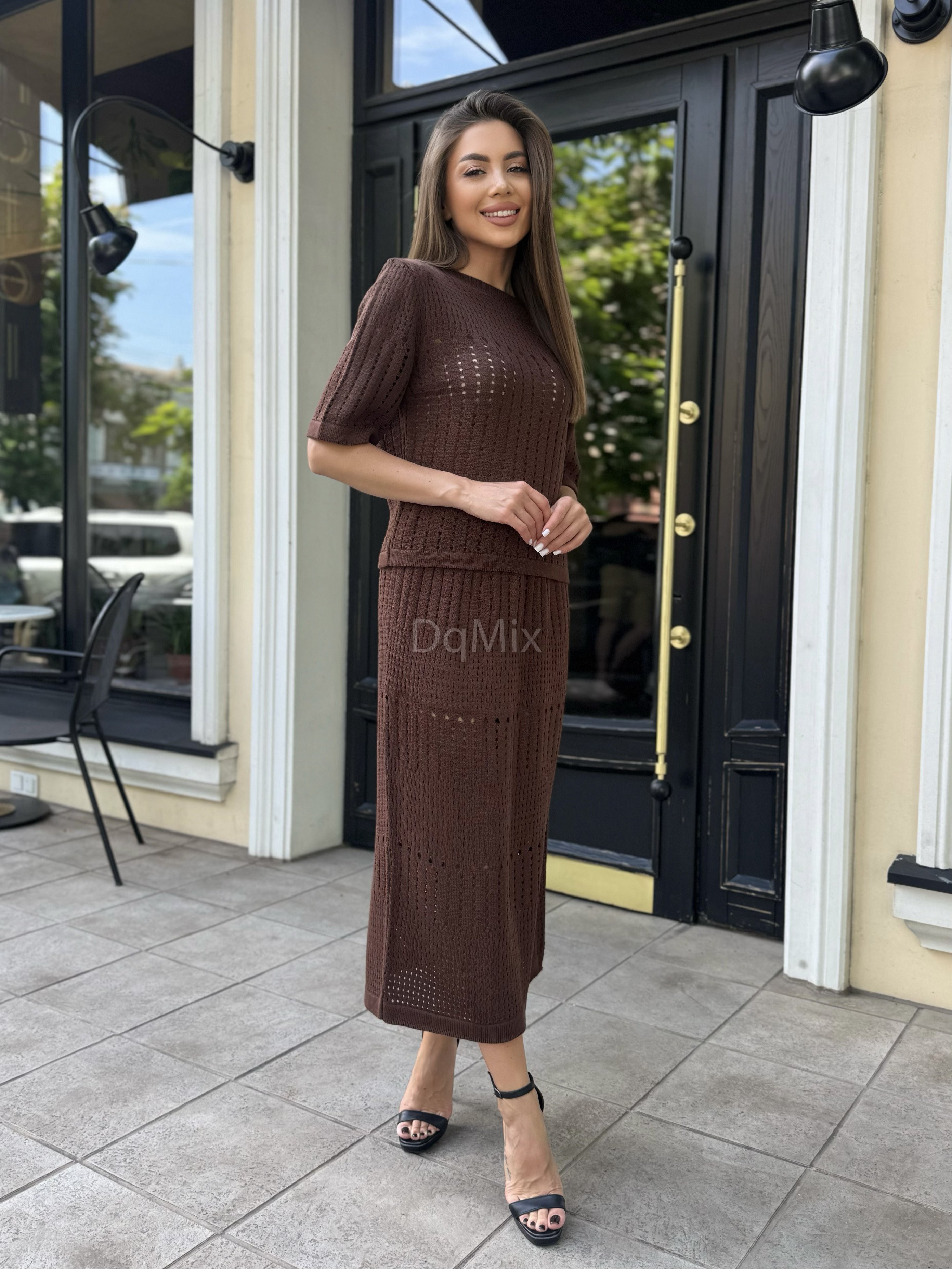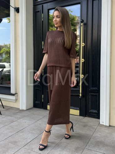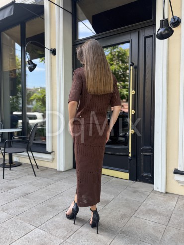 Костюм ажурний кофтинка зі спідницею на резинці , міді довжина у шоколадному кольорі #7003